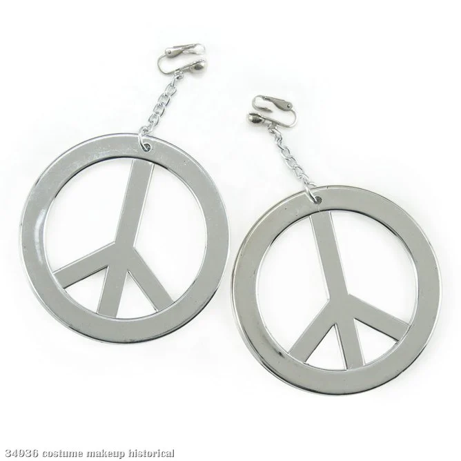 A groovy accessory for your 60’s costume! Features one pair of silver clip on earrings with dangling peace signs that measure 2¾”. Grab your picket signs and bell bottoms because it’s time to fight for peace!